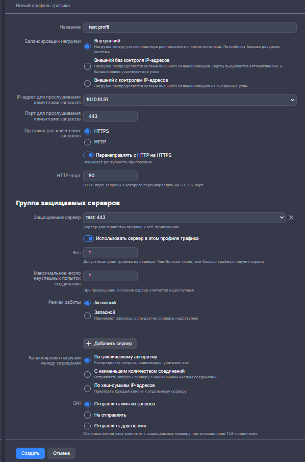 - В Профили трафика выберите ранее созданный ваши профиль.