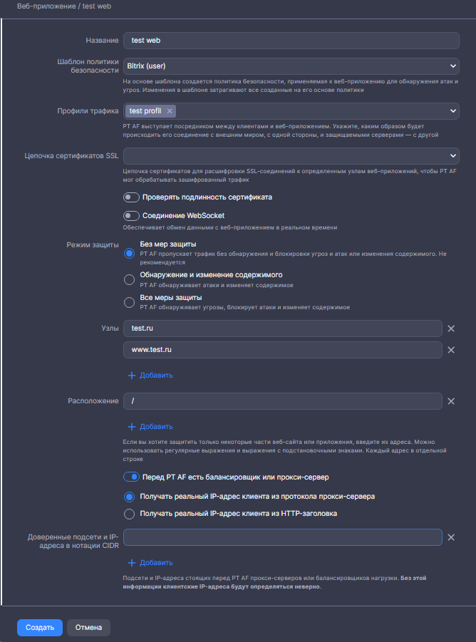 - Поставьте галочку у поля Перед PT AF есть балансировщик или прокси-сервер и через менеджера уточните адрес прокси сервера для вас.