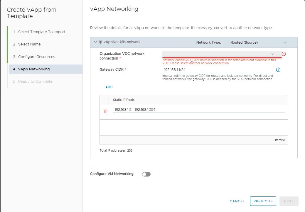 Для развертывания кластера кубернетес из шаблона, в интерфейсе VCloud Director, требуется минимум 24 ГБ RAM, 72 ГГц.