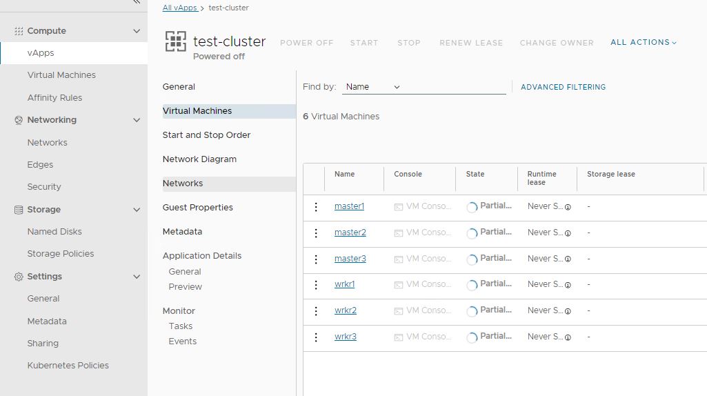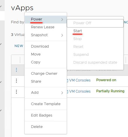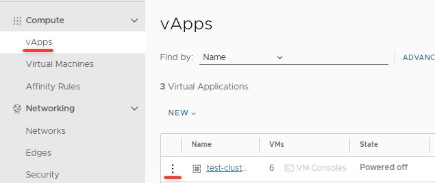 Для того, чтобы включить их, выберите пункт vApps в левом меню, затем на три точки слева от имени вашего кластера:
